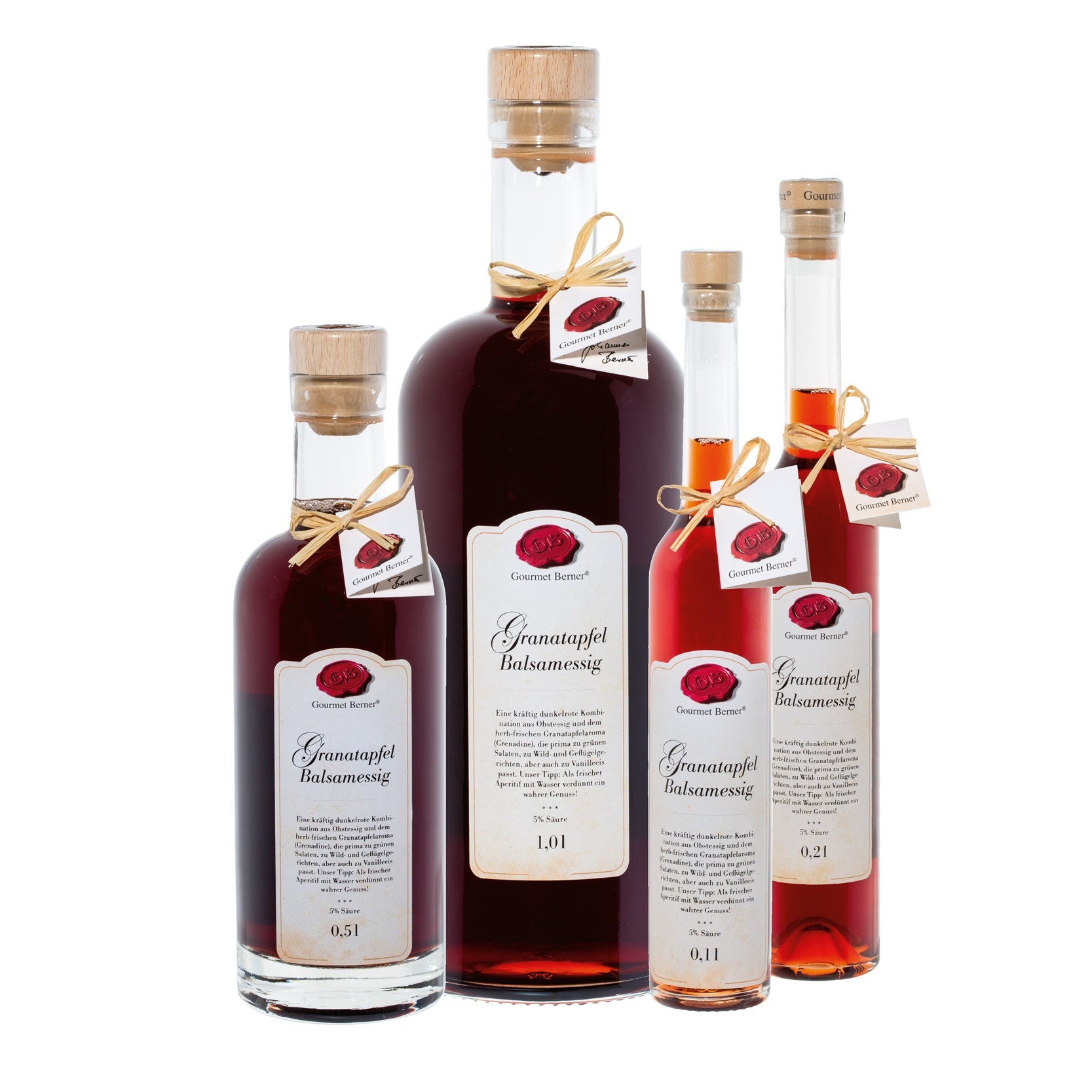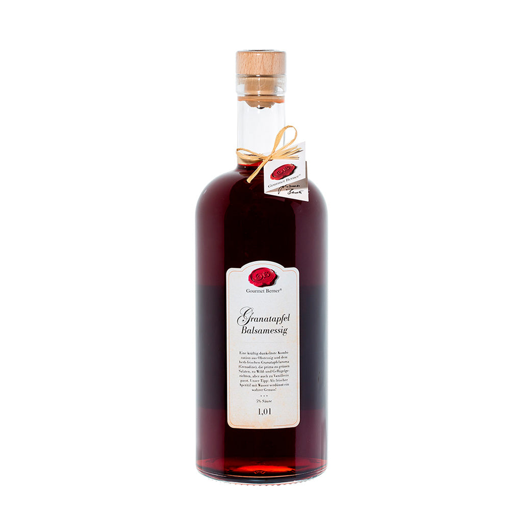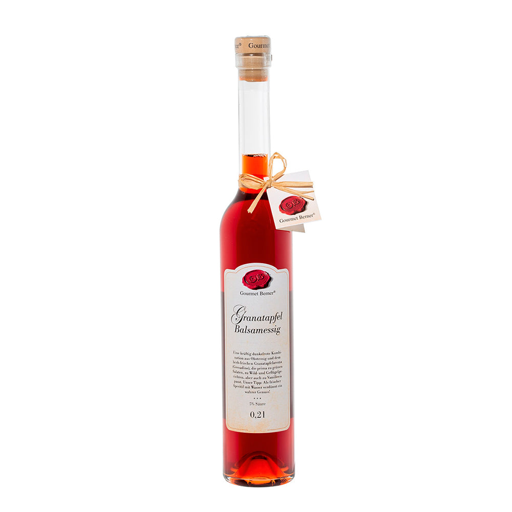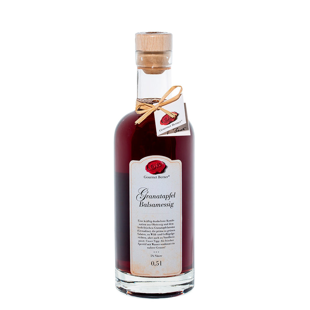 GranatapfelbalsamessigGranatapfelessig mit Granatapfelaroma, 5% SäureZutaten:Apfelessig, Granatapfelessig, Karamellsirup, Granatapfeldicksaft, Granatapfelaroma, Antioxidationsmittel: Kaliummetabisulfit.