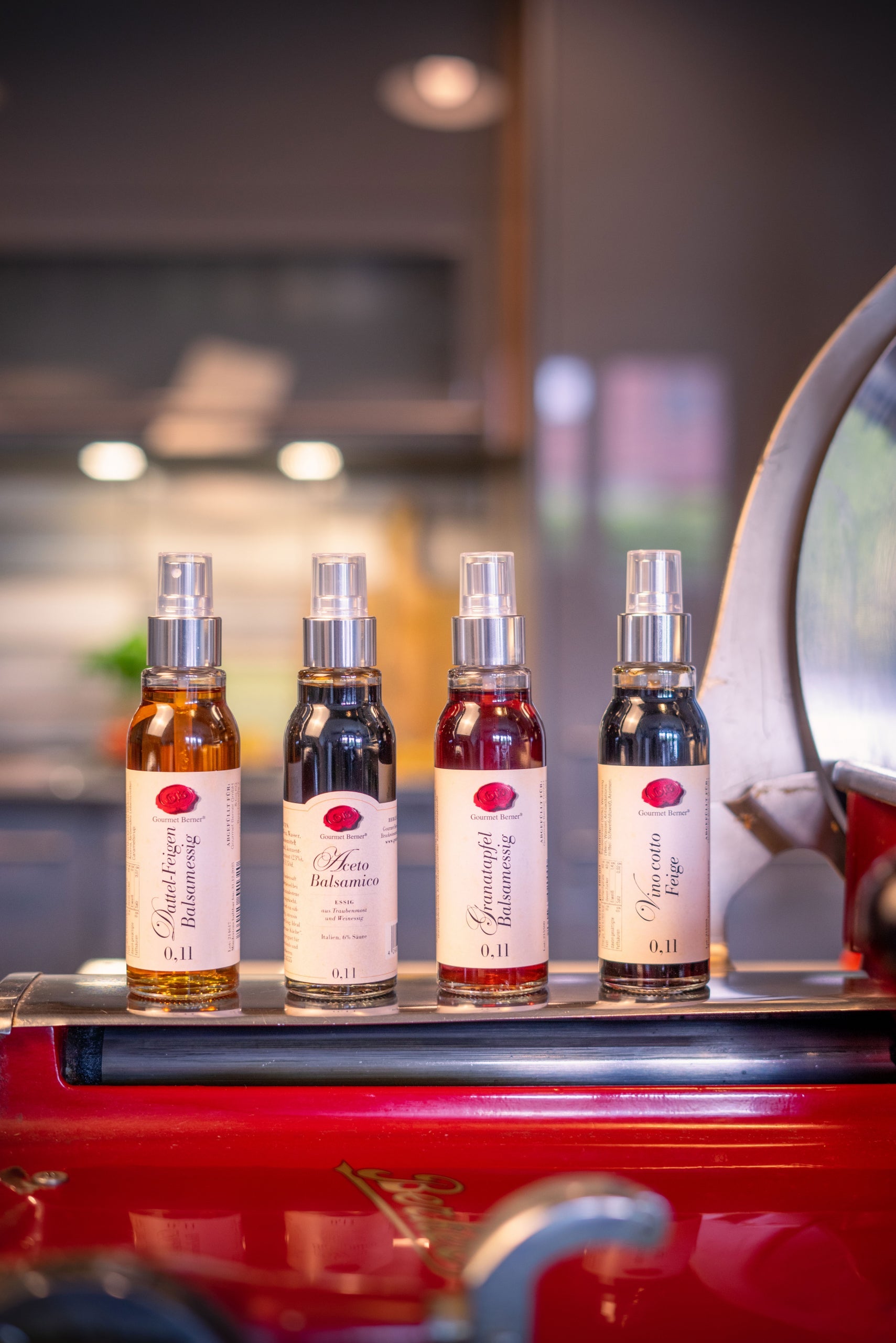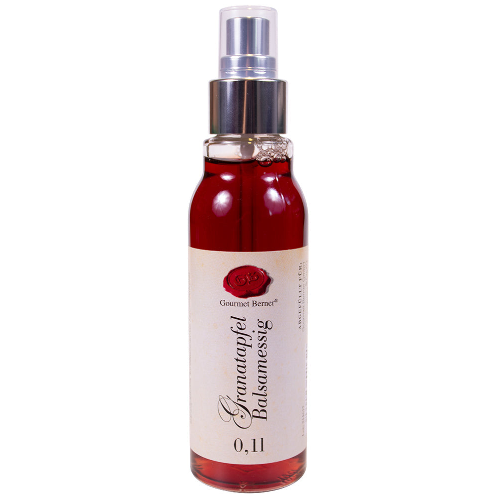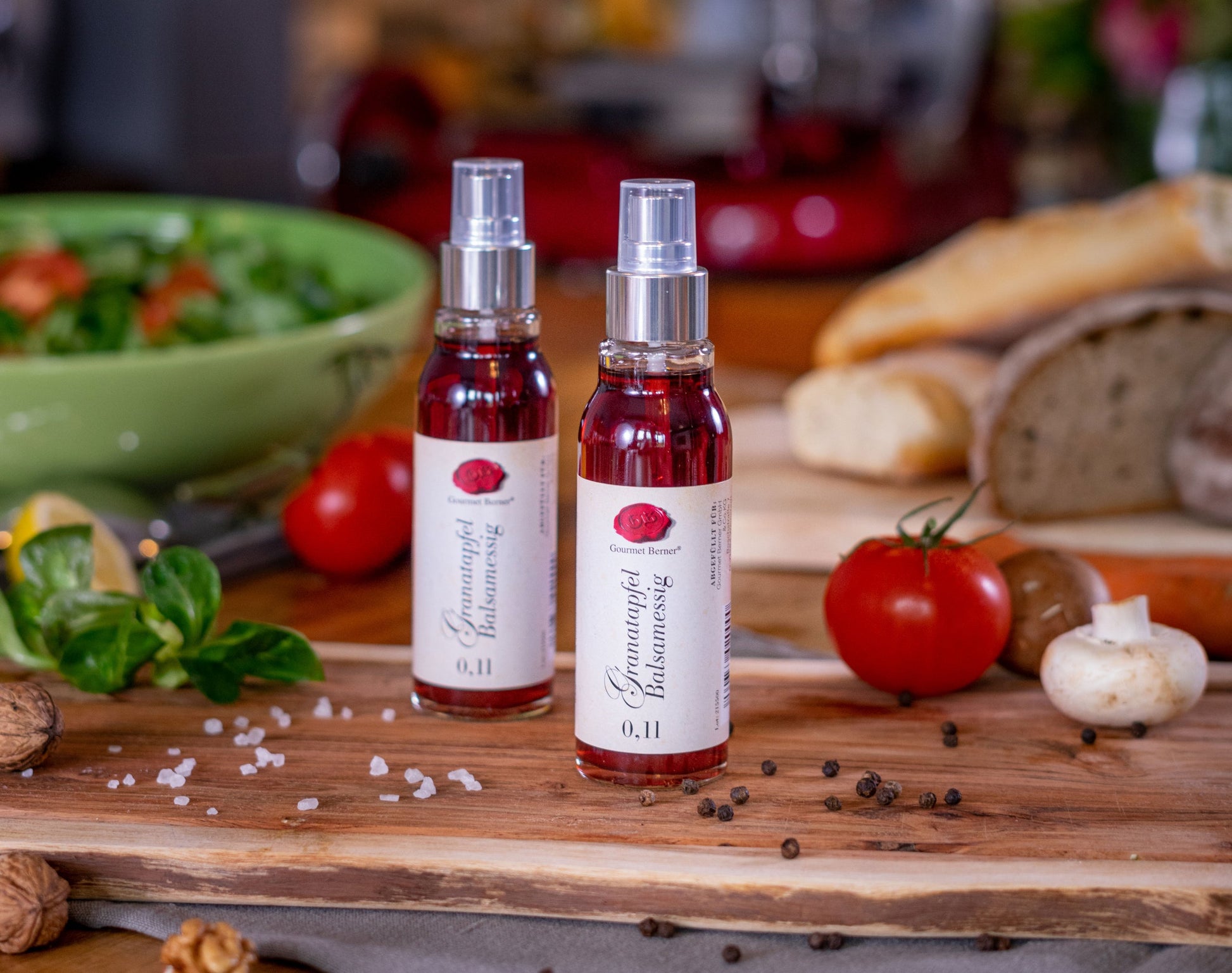 GranatapfelbalsamessigGranatapfelessig mit Granatapfelaroma, 5% SäureZutaten:Apfelessig, Granatapfelessig, Karamellsirup, Granatapfeldicksaft, Granatapfelaroma, Antioxidationsmittel: Kaliummetabisulfit.