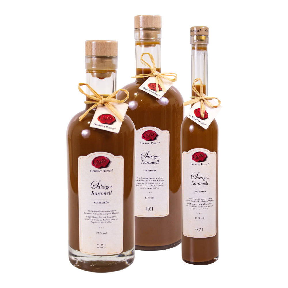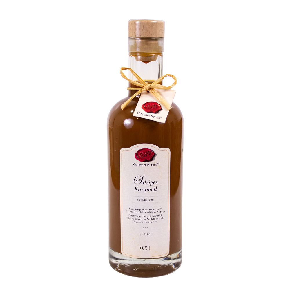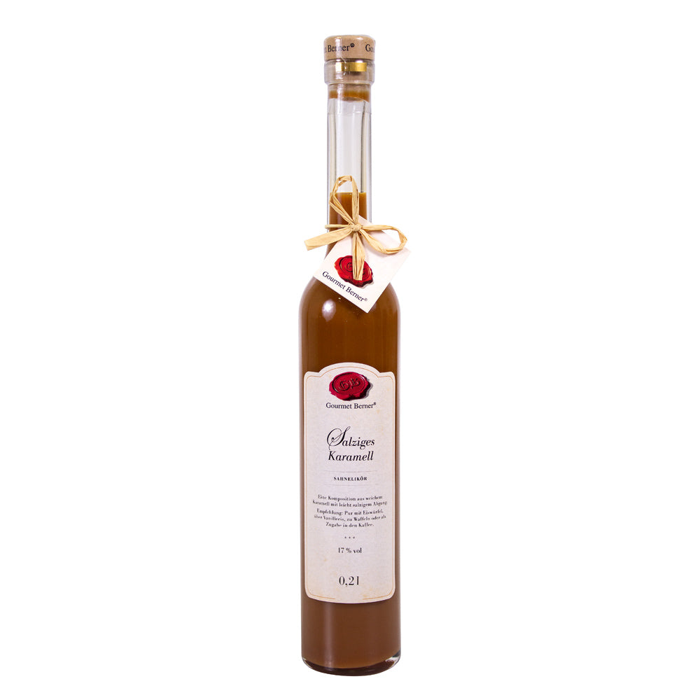 Salziges Karamell Sahnelikör, 17% vol.Eine Komposition aus weichem Karamell mit leicht salzigem Abgang.Empfehlung: Pur mit Eiswürfel, über Vanilleeis, zu Waffeln oder als Zugabe in den Kaffee.