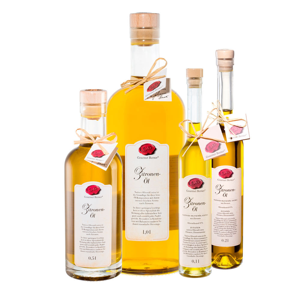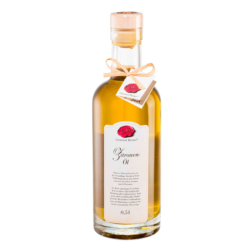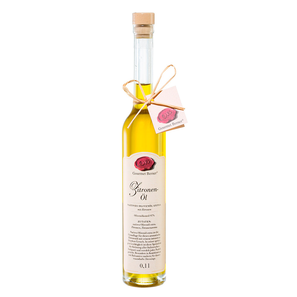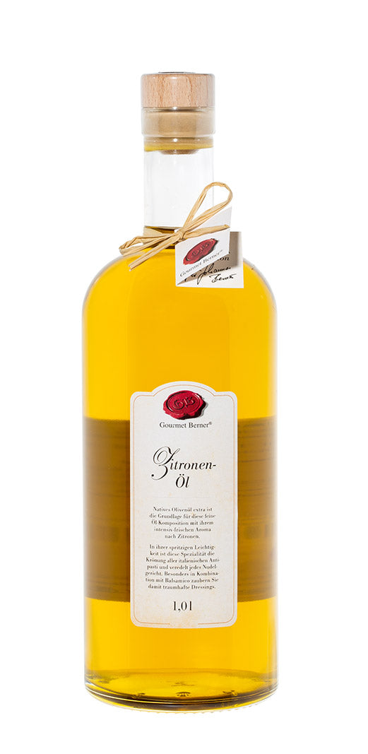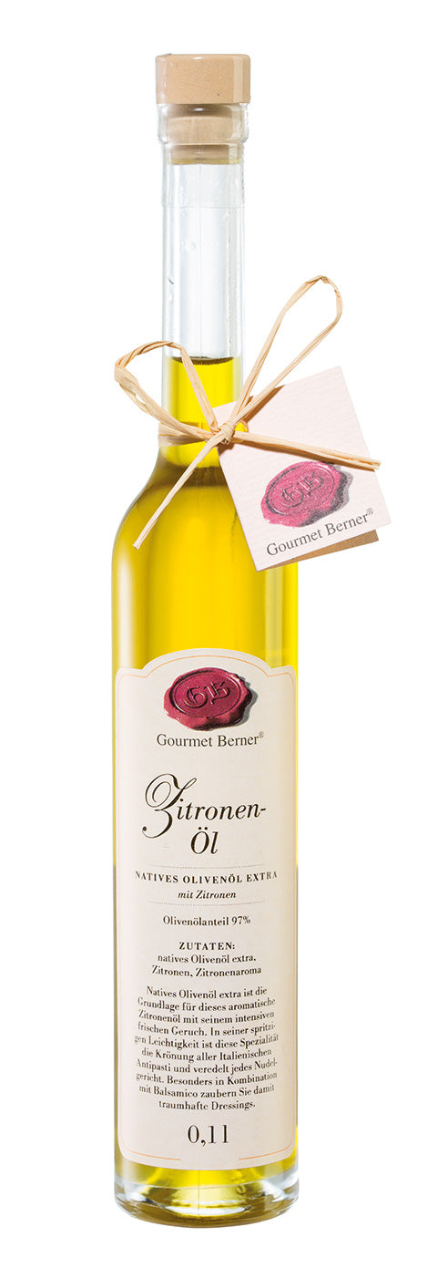 ZitronenölKomposition aus nativem Olivenöl extra mit Zitronenaroma, Olivenölanteil 99%Zutaten:Natives Olivenöl extra, Zitronenaroma.Nährwertangaben pro 100ml:Energie3404 kJ/828 kcalFett92,0 gdavon gesättigte Fettsäuren15,0 gKann geringe Mengen von Kohlenhydraten, Zucker, Eiweiß und Salz enthalten.